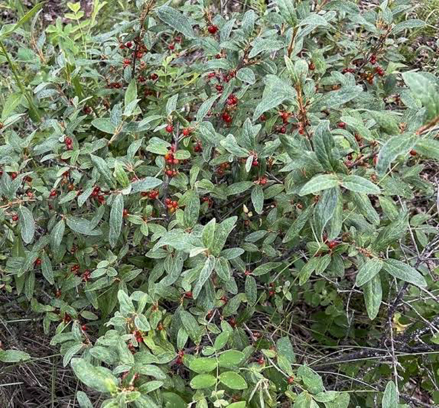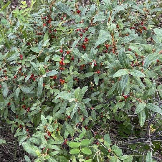 In spring, the Buffaloberry produces clusters of small yellowish flowers before leafing out with silvery-green foliage that shimmers in the sunlight. By midsummer, female plants bear abundant clusters of bright red berries—tart and edible, traditionally used for preserves and jellies. As autumn approaches, the silvery leaves and scarlet fruit add a splash of color and texture to the landscape before the shrub settles into winter dormancy.